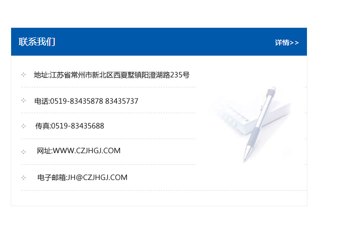 地址:常州市新北區友邦商務大廈1幢16、17層  電話:0519-85101652  傳真:0519-85112595  郵編:213022  網址:www_cz-jiayue_cn.luhuyiqi.com  郵箱:xiajifengaa@163.com